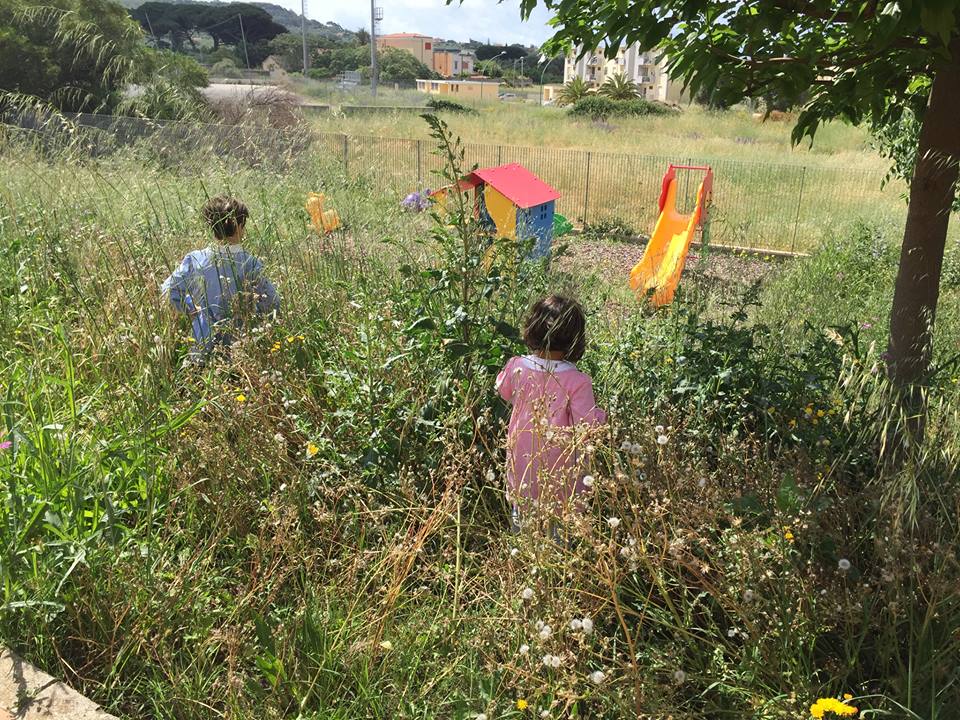 Nella foto la condizione del giardino dell’asilo coi bambini avvolti dalle erbacce