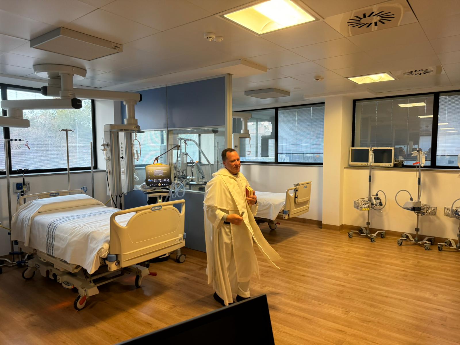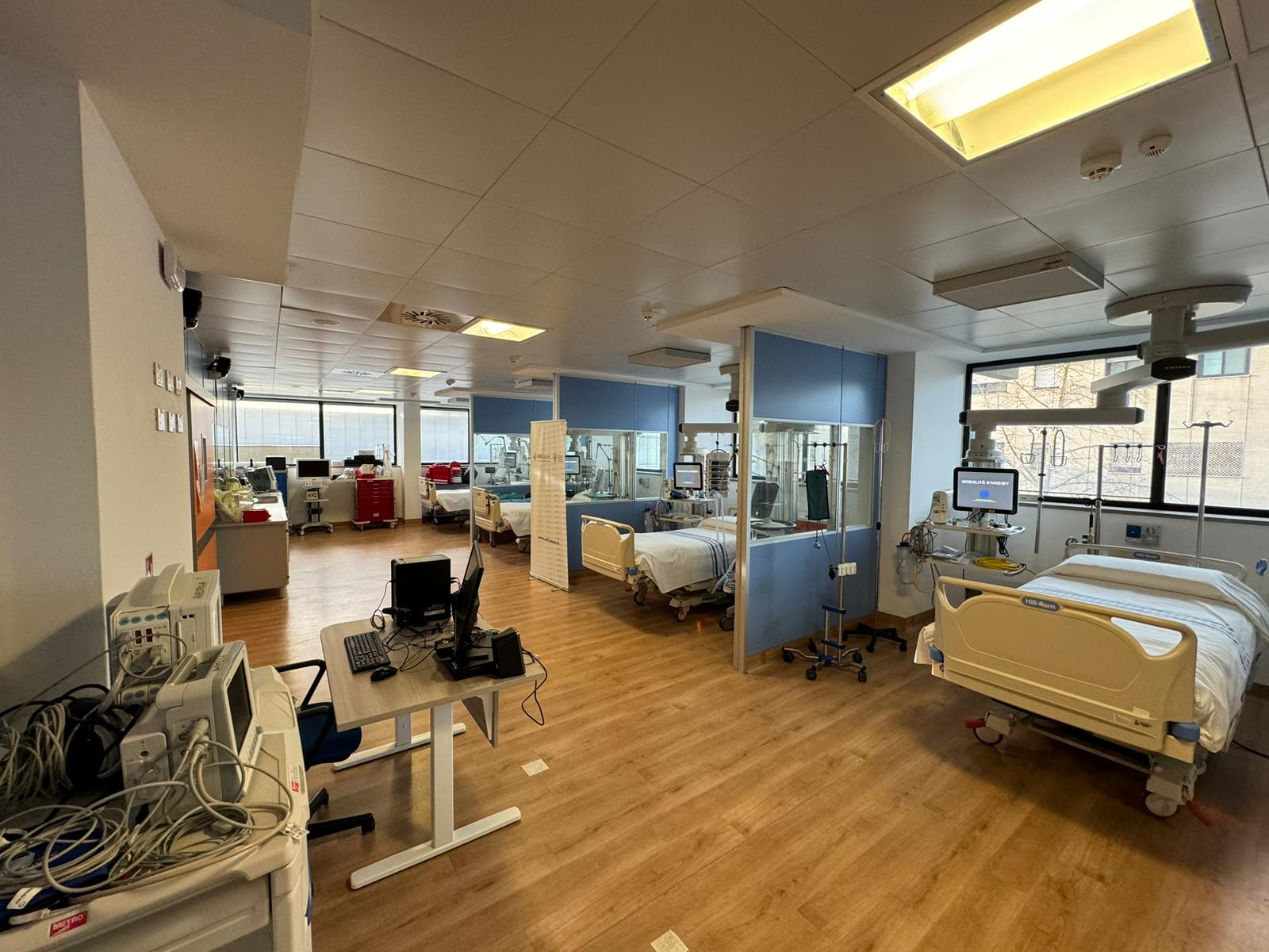 La struttura, originariamente concepita per essere destinata a Terapia Intensiva Cardiologica (Utic), è stata allestita, organizzata e attrezzata per accogliere 6 posti letto. All’ingresso del reparto è presente una stanza con una postazione di monitoraggio e un letto da adibire ad area di accettazione (shock room), oltre alle aree adibite alla centralina per il controllo anche a distanza del monitoraggio delle singole postazioni. Nell’Open Space le postazioni sono dotate di un letto da Terapia Intensiva, una colonna sospesa con sistemi di monitoraggio avanzato dei parametri vitali, una colonna con le pompe infusionali per la somministrazione di farmaci e un ventilatore da rianimazione per il supporto respiratorio dei pazienti. Si tratta di posti letto di area critica ad alto contenuto tecnologico e assistenziale per pazienti gravi di area medica, chirurgica e traumatologica.