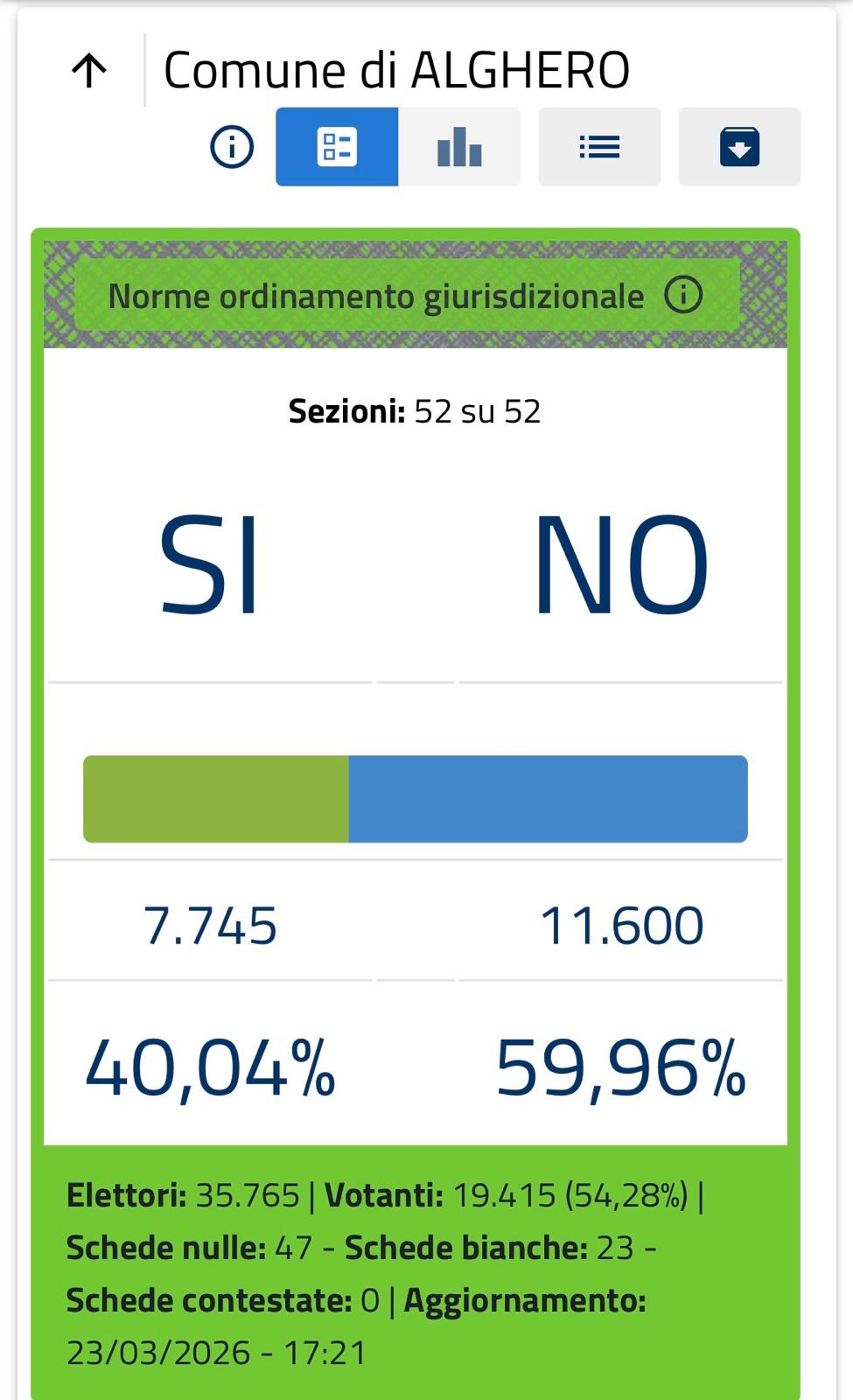 ALGHERO – Riforma della giustizia bocciata con anche un boom di affluenza alle urne: il dato definitivo si attesta intorno al 58,9%. Con quasi tutte le sezioni scrutinate, il “No” ha ottenuto poco meno del 54%. In Sardegna vince il “No” che è al 53%, Alghero sulla stessa lunghezza d’onda con una batosta per il “Si”, fermo al 40% e una netta vittoria per il “No” che ha raggiunto il 60%. Risultati che non possono non avere dei riflessi sulla politica regionale e locale.