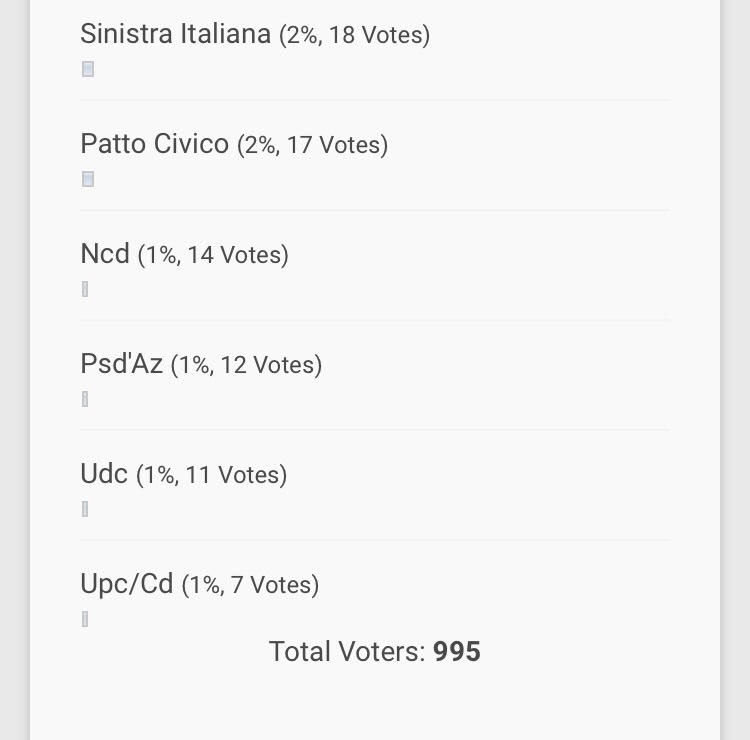 Il sondaggio certifica che il centrodestra, qualora si considerasse un’alleanza classica, è ancora nettamente in vantaggio. E’ chiaro l’impegno di sostenitori e supporters del partito di Giorgia Meloni che lo fanno volare in testa. Tra le forze più “giovani” c’è l’importante dato di Noi con Salvini e la conferma dei Pentastellati. Mentre viene confermato il radicamento di Forza Italia ad Alghero e, nonostante, le varie vicende locali anche il Pd ottiene un buon risultato cosi come anche i Riformatori. Risultati insoddisfacenti, invece, per la sinistra, lista civiche del sindaco e piccoli partiti, mentre trova un sufficiente spazio il movimento di Pili. Da evidenziare i pochi voti raccolti da alcune tra le principali forze che oggi governano il centro catalano. A breve sarà realizzato e proposto un altro sondaggio sempre sull’andamento politico cittadino. Mentre nelle prossime settimane troveranno spazio anche test-flash (con un tempo ridotto e più limitato per il voto) su temi specifici riguardanti la città e non solo.