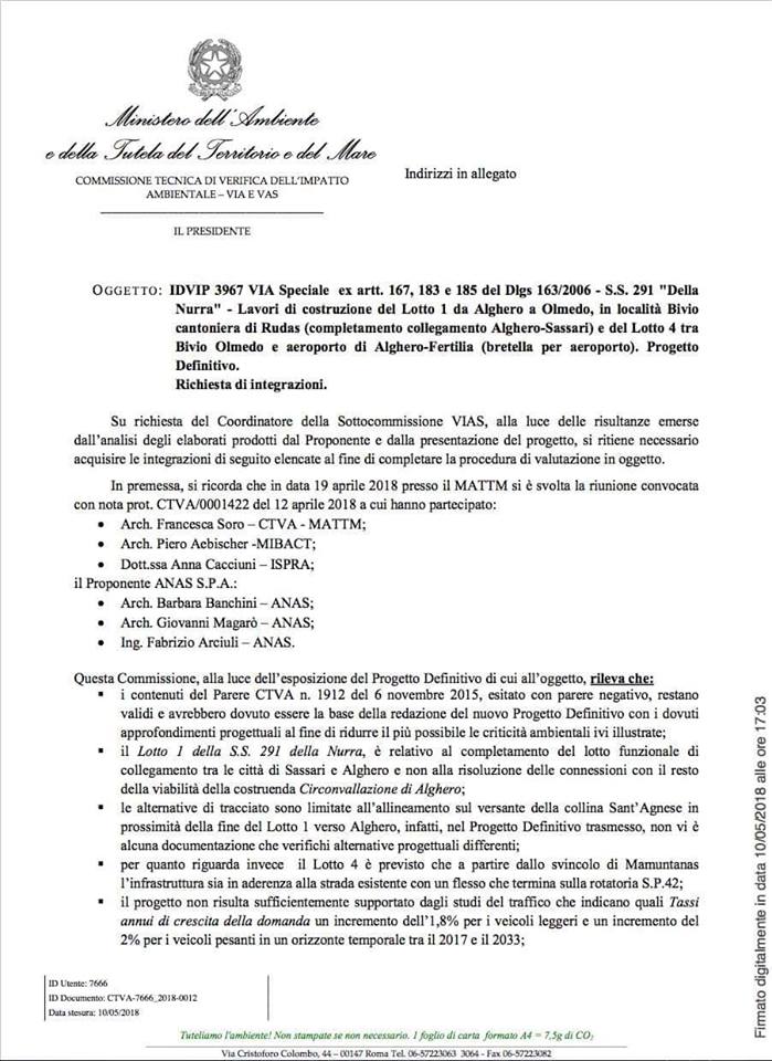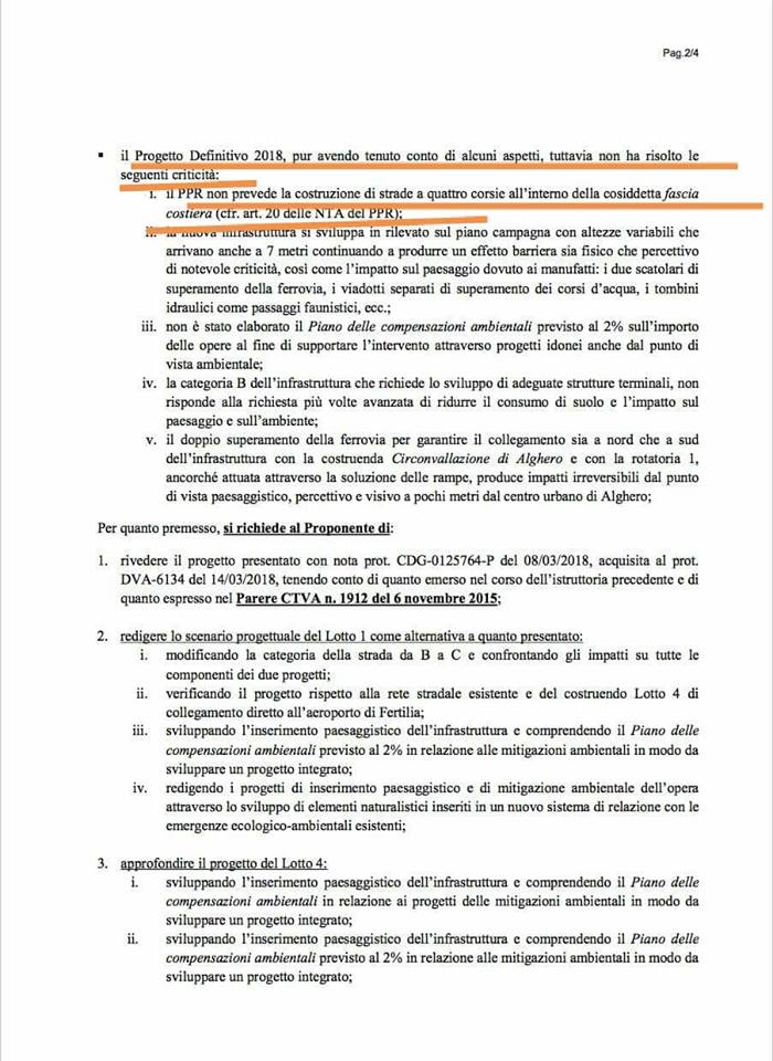 “A seguito di quanto evidenziato, il Dipe (con nota del 2016), ha ritenuto di rinviare a nuova istruttoria, senza dar luogo a delibera, il progetto denominato Ss 291 della Nurra – Lotto 1 da Alghero ad Olmedo, in località bivio cantoniera Rudas, predisponendo di aggiornare ed integrare il progetto con alcune prescrizioni e includendo anche la realizzazione del Lotto 4 di collegamento è stata avviata di nuovo la procedura di Via su un nuova configurazione progettuale comprendente il Lotto 1 e il Lotto 4”.